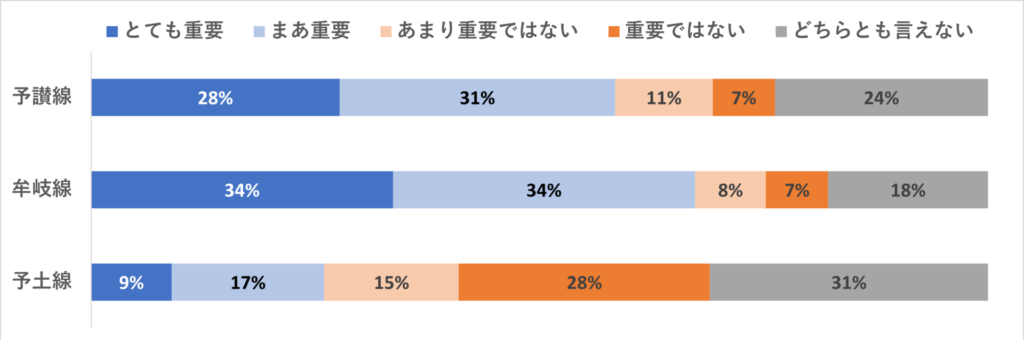 一方の予土線は、利用している人では「とても重要」「まあ重要」が8割もありますが、非利用者では26%しかありません。むしろ「重要ではない(28%)」のほうが高いです。予土線沿線では、鉄道が日常の移動手段として使われないばかりか、「鉄道がなくても困らない」と考える人たちが多いことがうかがえます。